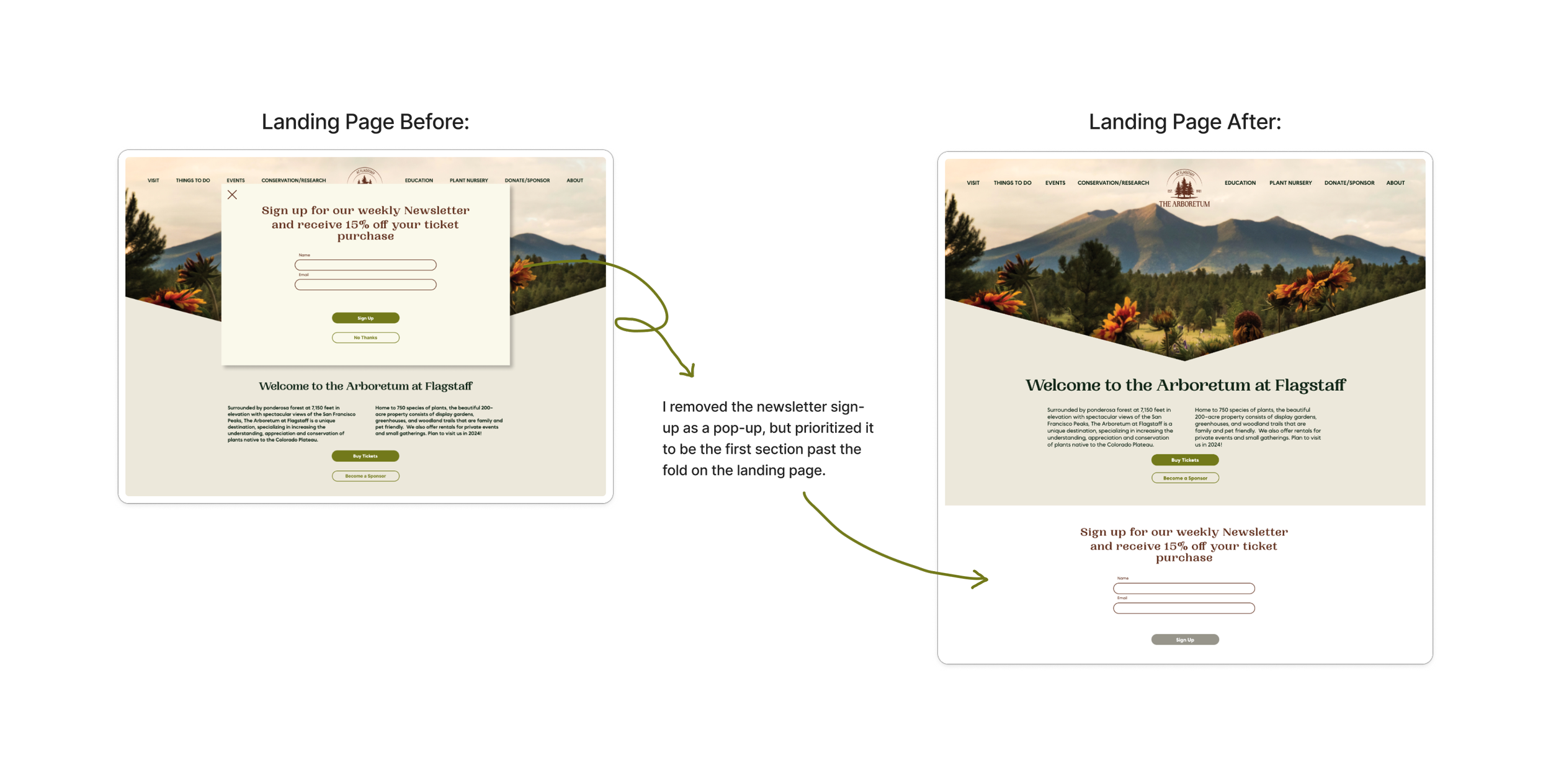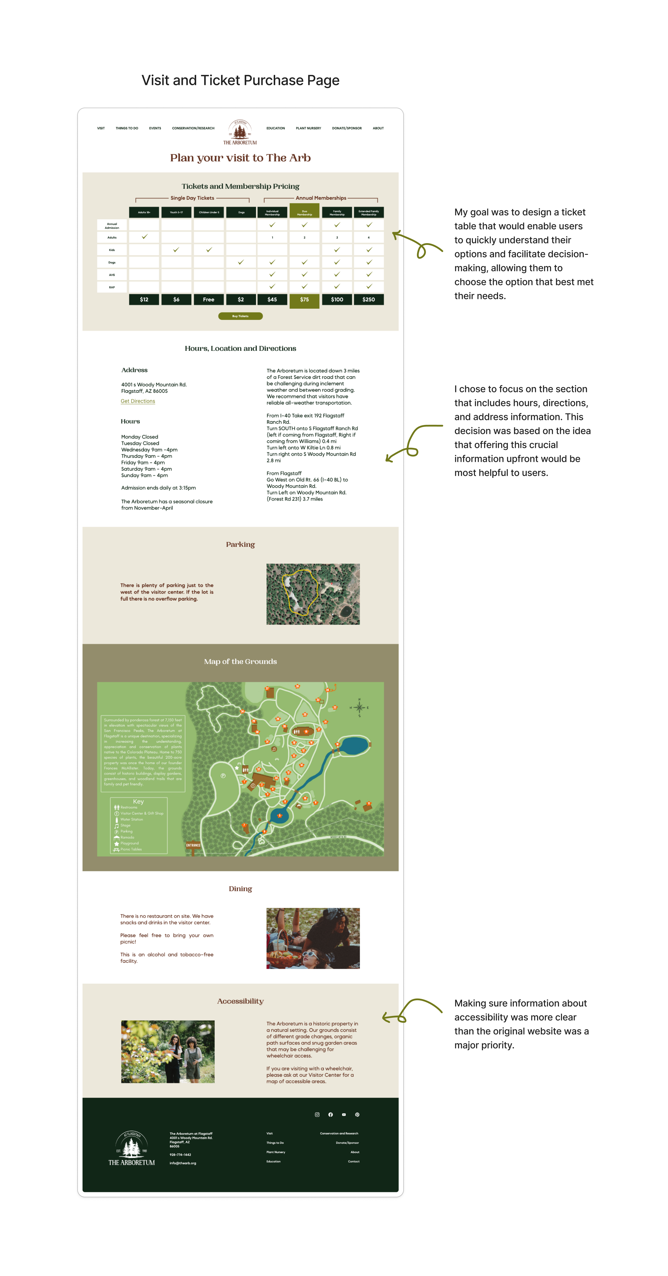 This method enabled me to prioritize features that would increase patronage of the arboretum such as a newsletter sign-up, purchasing tickets or a membership, and requesting a quote for a private event.